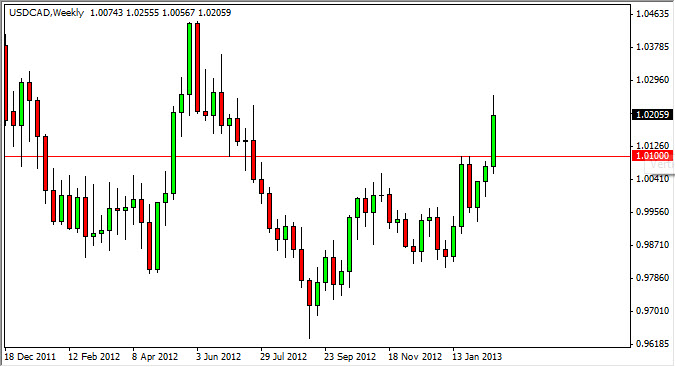 The USD/CAD pair shot straight through resistance at the 1.01 level during the past week as the Canadian dollar simply has not been acting quite right. The 1.01 area was significant resistance, and as a result I think this market has a lot more left in the tank. However, a pullback to retest that area as support is more than likely, making this a potential "buy on the dips" type of market over the next couple of sessions. I believe that we will eventually test the 1.04 level, and possibly as high as the 1.05 handle.