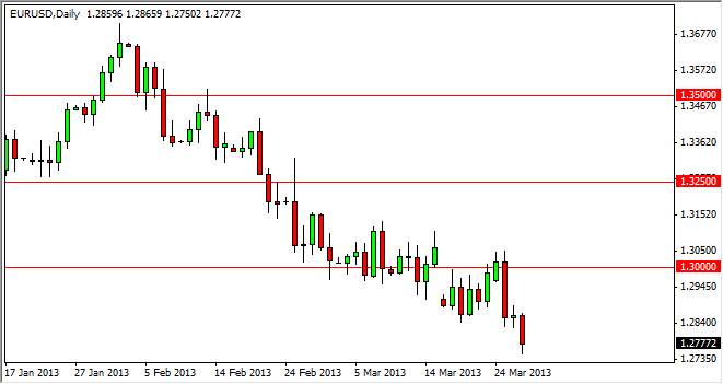 The EUR/USD pair fell rather significantly during the session on Wednesday, as you can see by the chart. The 1.2850 level that had been thought of as support got busted relatively easily, and we even tested the 1.2750 level by the end of the day. This of course is predicated upon the concerns of all things related the Cyprus, and the potential bank runs that we are about see during the next day or two.