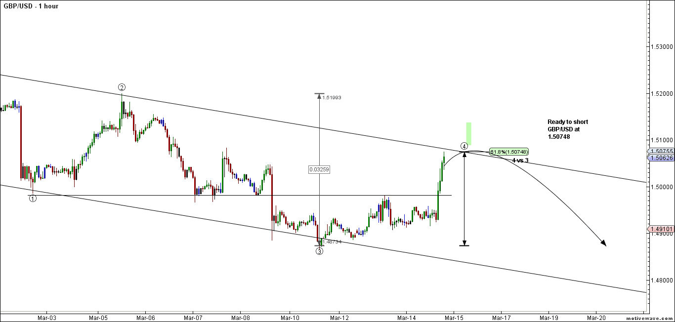 Description: Looking at the falling channel in a diagonal pattern in extended wave (v) for GBP/USD, We can notice wave (4)/(D) has accessed wave (A) in the golden 0.618 popular Fibonacci ratio touching the upper trend line which suggest a reversal in trend is expected at 1.50748 price level. I will short the pair at this point with open target and stop loss just above 1.5150 for expected wave (5)/(E) expected drop in order to complete the extension of the final wave. Good luck on your trade.
