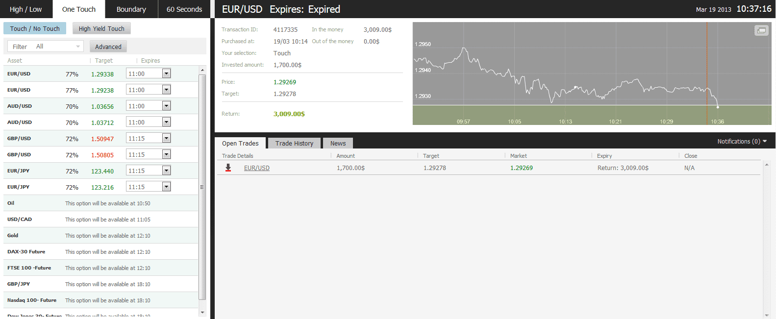 The market price for the EUR/USD at the buying time (10:15) was 1.29348 and the target price was 1.29278 for the expiry of 10:45. The asset touched my target price at 10:36 and I made $1309.