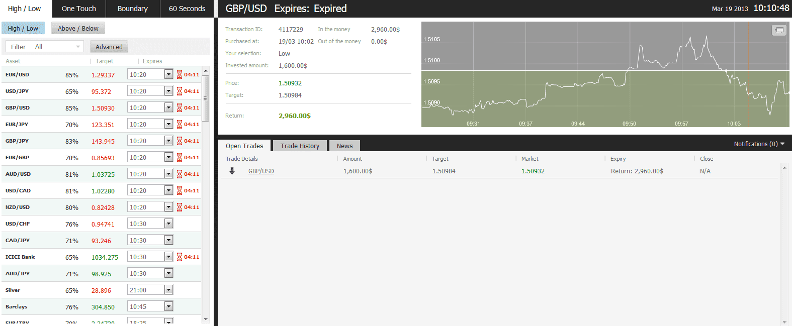 The target price for GBP/USD at the buying time (10:14) was 1.50984 for the expiry of 10:10. The asset closed on 1.50932 and I made $1360 in less than ten minutes.