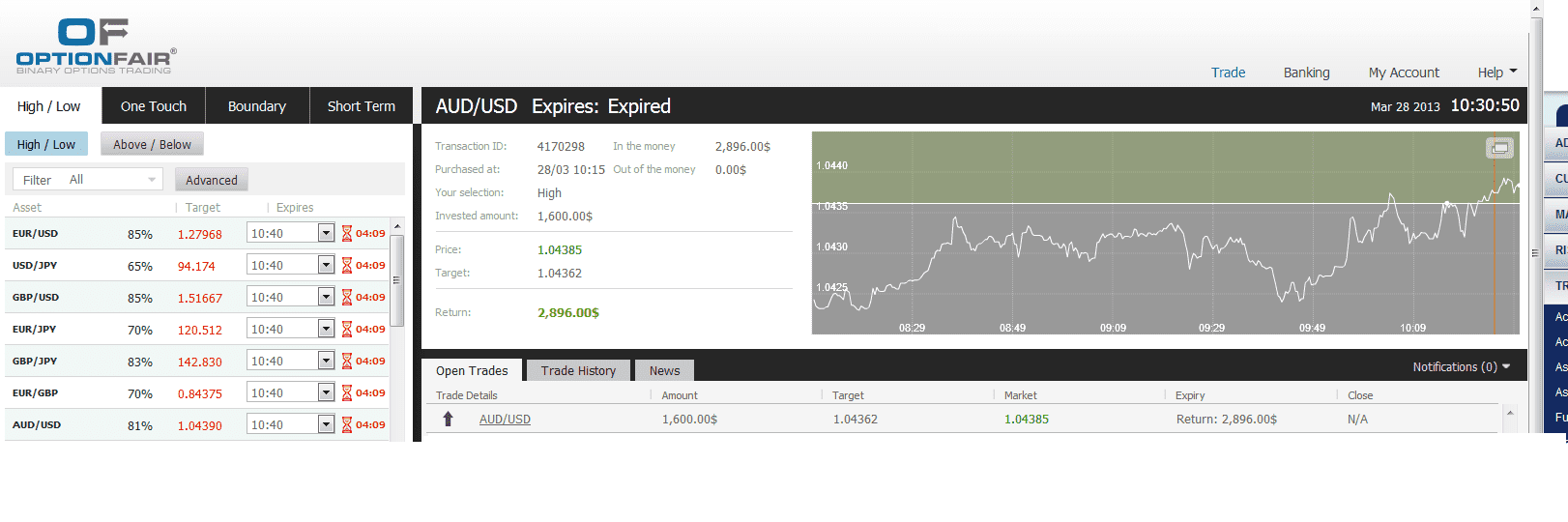 The target price for AUD/USD at the buying time (10:15) was 1.04362 for the expiry of 10:30. The asset closed on 1.04385 and I made $1296.