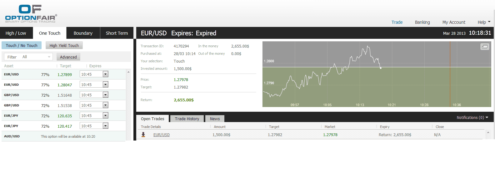 I logged onto the OptionFair binary options trading platform and I traded $1500 on the “Touch down” instrument. This kind of option has a return of 77% if the option touches the strike price prior to expiry, which means that if the signal is correct, I could get a return of $1155 on my investment.