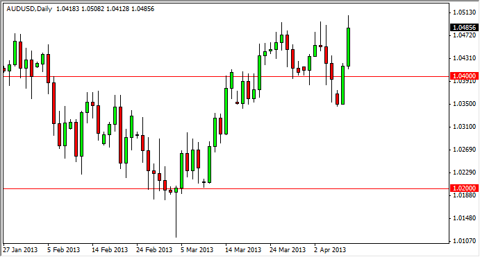 The AUD/USD pair had a strong showing on Tuesday, breaking all the way up to the 1.05 level again. However, by the end of the session we did pullback a little bit as the 1.05 level offered far too much resistance. The biggest problem with this bullish move is that it all happened in one day and therefore I can't necessarily take advantage of it. This is mainly because of the fact that I've seen so much noise above 1.05, and think that the real launching point will be at the 1.06 handle.