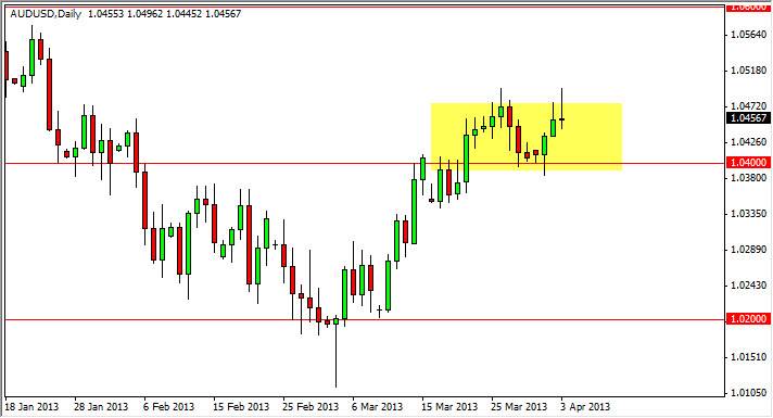 The AUD/USD pair initially rallied during the session on Wednesday, but as we have seen several times before, the 1.05 came in as significant resistance. As far as the recent action is concerned, this has form what looks like it could be a double top. However, there is a ton of support at the 1.04 level, so this represents more consolidation than anything else as far as I'm concerned.