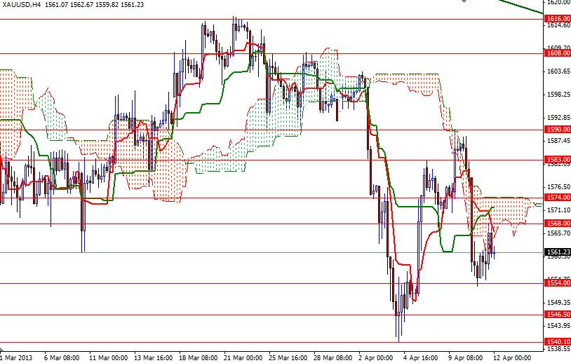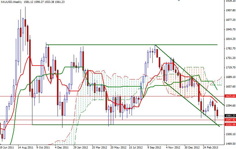 The XAU/USD pair (Gold vs. the American dollar) closed the day slightly higher than opening as the lowest prices since last summer attracted some buyers yesterday. However, better-than-expected data out of the U.S. limited the shiny metal's gains. Data released by the Department of Labor showed that the number of Americans who filed for unemployment insurance payments for the first time decreased by 42000 to 346000, pointing to further improvement in the labor market. Recently the pair has been trying to build some type of base just above the 1554 level but charts don't show any real bullish momentum. Major equity markets continue to rally and USD/JPY is approaching to its highest level since May 2009. From a technical point of view, I think a weekly close under the 1554 level will be highly negative for the pair since we are currently trading below the lowest settlement price since mid-2011.