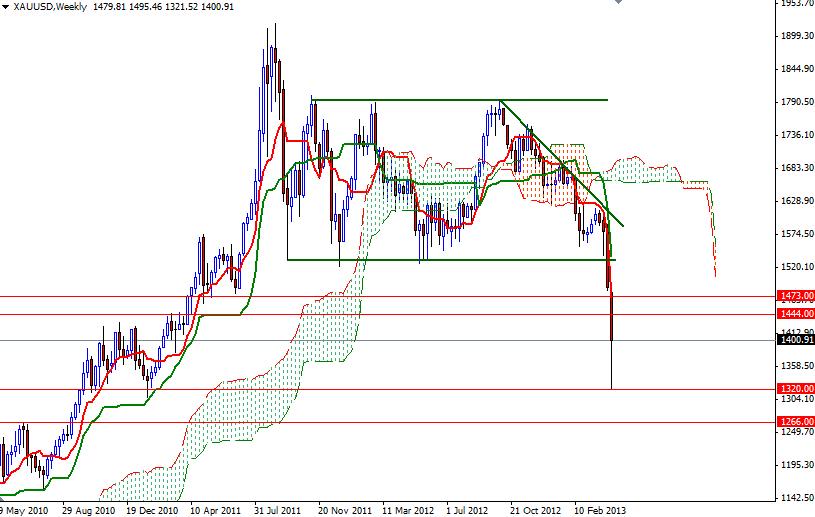Although gold prices closed higher than opening for days in a row, we had a bearish candle on the weekly chart. The XAU/USD pair traded as low as 1321.52 on rumors that the government in Cyprus is going to sell its gold in order to supply additional funds which will be required to solve the crisis in banking sector. Although the pair found some support and lost its initial momentum, breaking out of the rectangle (which gold prices had been running in since September 2011) was a very important event for those who believe in technical analysis. Because of that I think gold prices will continue its decline in the long term (until the charts show a reversal pattern of course). If you measure the previous consolidation area (roughly between 1795 and 1530) which is broken now, you could get a very reasonable target of 1266. Maybe this sounds crazy but this is what we get when we look at the charts from a purely technical point. However, just one week ago I was telling that we are going to reach 1446.50 and 1325 eventually.