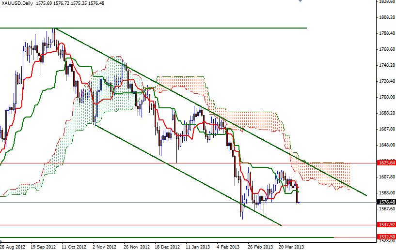 The markets were finally back at full strength yesterday after the Easter holiday around the world. The XAU/USD pair dipped to a low of 1573.85, which happens to be just above the support level of 1572, as investors turned to the relative safety of the U.S. dollar on intensifying worries over ongoing problems in the eurozone. On several occasions I have mentioned that the pair would remain under a strong pressure while trading within the descending channel which we see clearly on the daily time frame. Until the conditions in the market place change (strengthening U.S. economy and heightened appetite for more conventional assets, such as U.S. equities), I believe that the shiny metal will sink deeper. Technically speaking, the overall trend will be dominated by the bears as long as prices continue to move below the Ichimoku cloud on the daily chart.