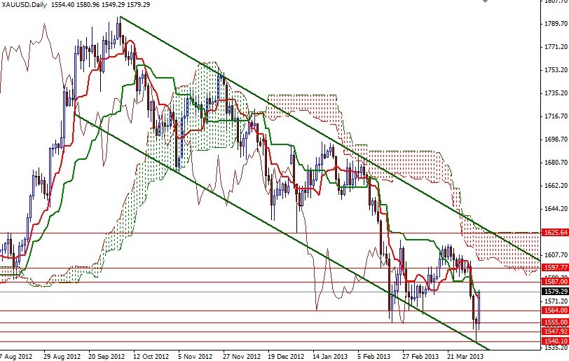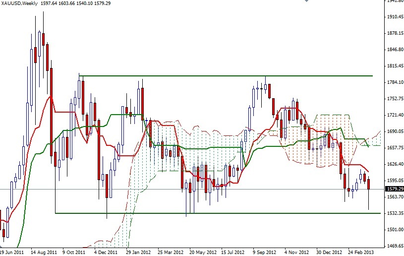 Although the XAU/USD pair (Gold vs. the Greenback) fell for the week, the pair bounced off of the 1540.10 level which was roughly the bottom of the descending channel that the market players have been following since October. We had a strong bullish candle on the last the last trading day of the week as closely watched nonfarm payroll numbers came out much weaker than anticipated. Data released by the Labor Department showed that payrolls grew by 88K in March. I think we should examine the weekly chart at the end of each trading week in order to see where we stand in the bigger picture and where we might be heading next.