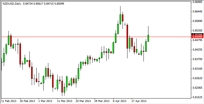 The NZD/USD pair rose during the session on Thursday, breaking above the vital 0.85 resistance area. However, we did see quite a bit of the gains reversed, and eventually printed somewhat of a shooting star like candle. With that being said, I believe that since we are closing above the 0.85 handle that this market will continue higher, but it will be more of a grind and less of a shot straight up.