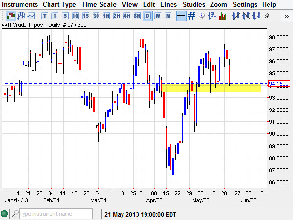 Quite frankly, I find it difficult to short this market until we get below the $92.00 handle. Because of this, I am simply going to sit out and watch it move back and forth knowing that we are heading into the summer months. The summer months of course tend to be very range bound, and again I still believe that we are trying to figure out that ranges we speak. I think that the $92.00 level could in fact be the bottom that range, while the $97.00 level looks certainly like it could be the top.