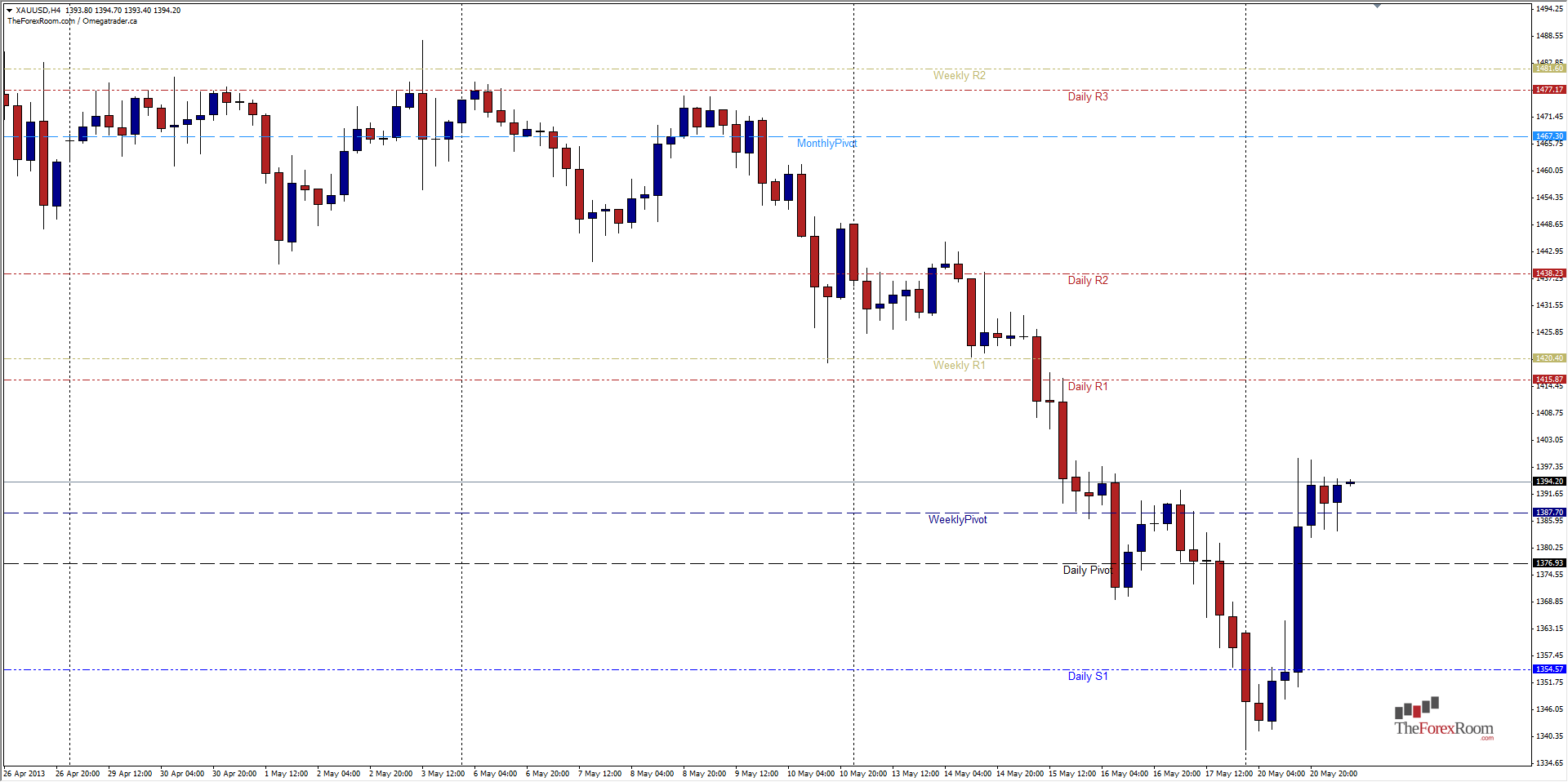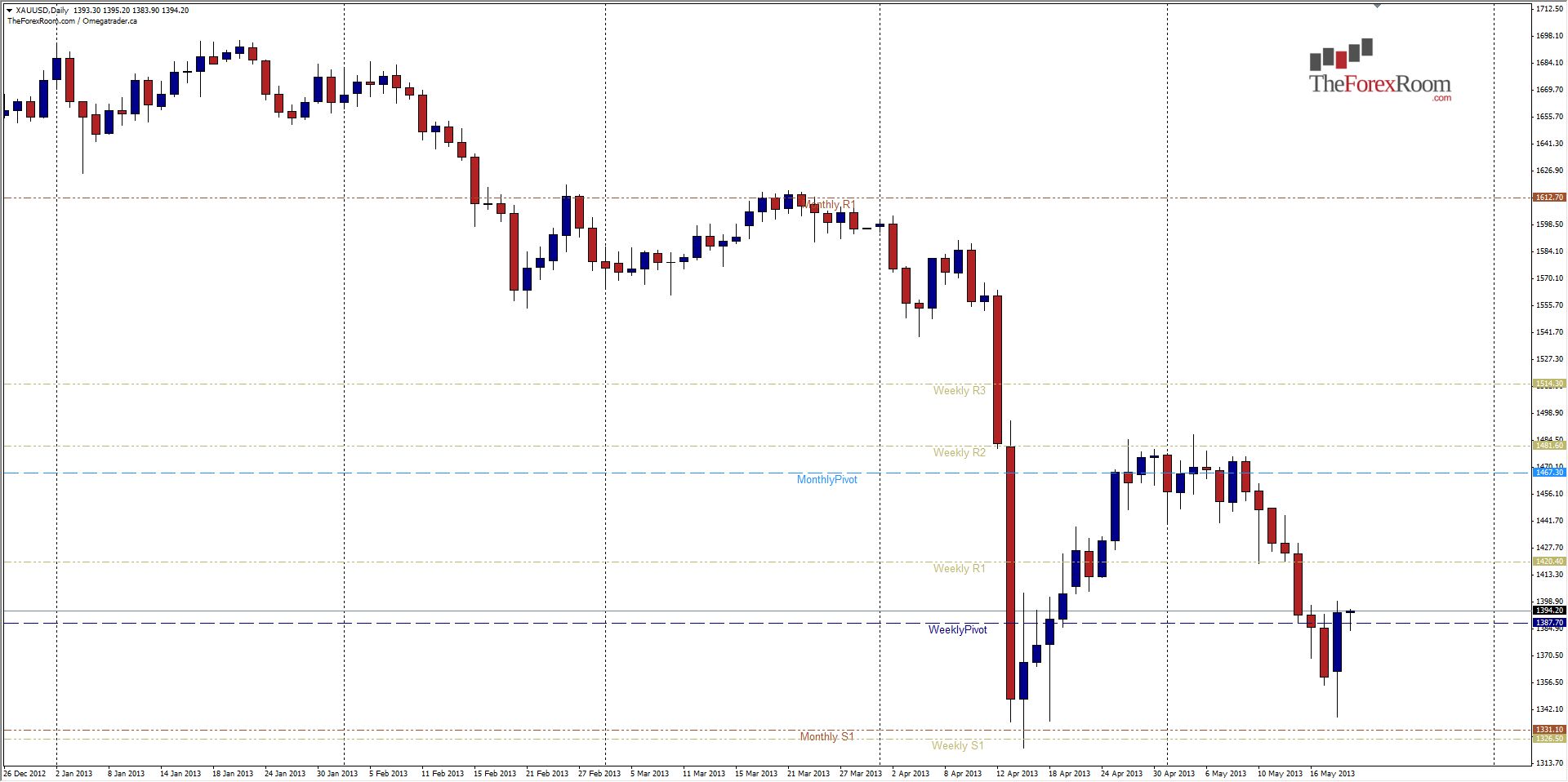 Ultimately, if prices can once again close above 1482 (Weekly R2) aka the highs from late April through the first week of May we could see a full retracement back to the 1550 area. However, if the US Dollar continues its run, and this pair falls back below 1320 then we could see a continued bearish run down to November 2009 and June 2010 highs in the 1230 area.