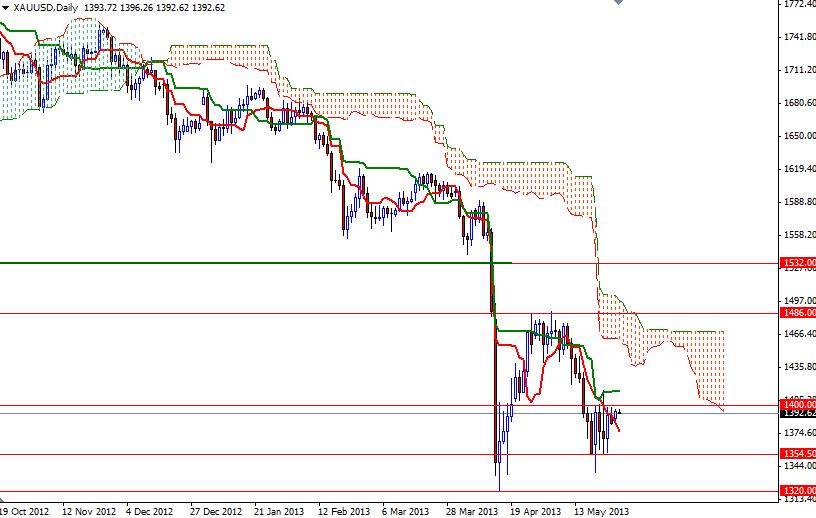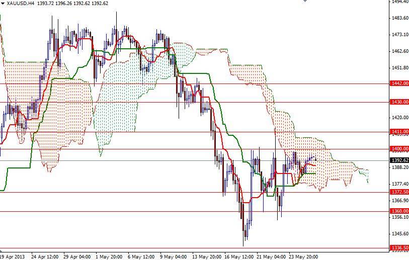 Gold prices (XAU/USD) rose slightly on Monday as concerns about volatility in the global equities and recent strength in the Japanese yen increased the precious metal's appeal. However, it appears that the bulls are having hard time to shatter the first barrier at 1400. The 1400 area has been a cap on the price of gold for the last eight trading sessions and as a result we continue to see the sellers come in and step up the pressure every time the buyers have a chance to break out. Of course yesterday's price action was not a big surprise since U.S. and London markets were closed for public holiday. On the one side we have growing expectations of a reduction in quantitative easing, while on the other side lower spot prices have been attracting buyers. Although recent reports shows the central banks from emerging countries continue to purchase gold as a way of strengthening and diversifying their assets, breaking below the 1532 level, which held the bears' advance for 80 weeks, was a significant event from a technical point of view. On the weekly and daily time frames, prices remain below the Ichimoku cloud, suggesting that the overall trend is bearish. On the 4-hour chart, the XAU/USD pair is consolidating inside the cloud.