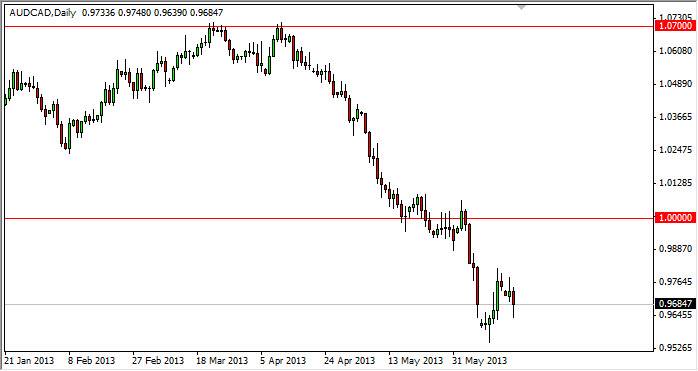 The AUD/CAD pair fell during the session on Tuesday, but as you can see got a bit of a bid at the previous hammer that had formed at the absolute low that we've seen recently. It appears that the 0.9650 level is offering a bit of support, and as a result the market formed a nice looking hammer. However, the candlestick from Monday is a shooting star and we are of course in a very strong downtrend. Although I believe that this market is a bit oversold, and the fact that we have formed a hammer on top of the previous hammer from last week suggests that we will more than likely break through that shooting star.