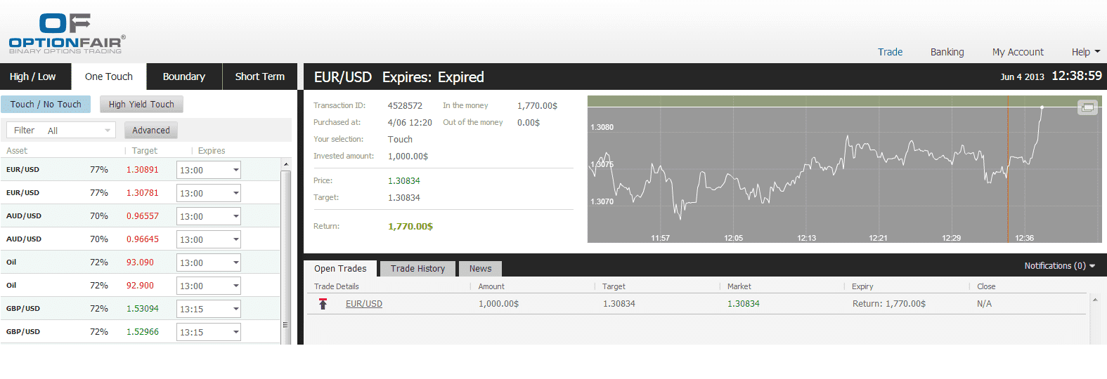 On the OptionFair trading platform, I traded $1000 on the “Touch” instrument. This kind of option has a potential return of 77% if the option touches the strike price prior to the expiry, which means that if the signal is correct, I could get a return of $770 on my investment.
