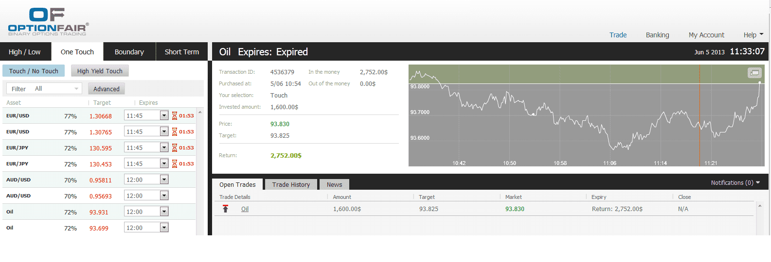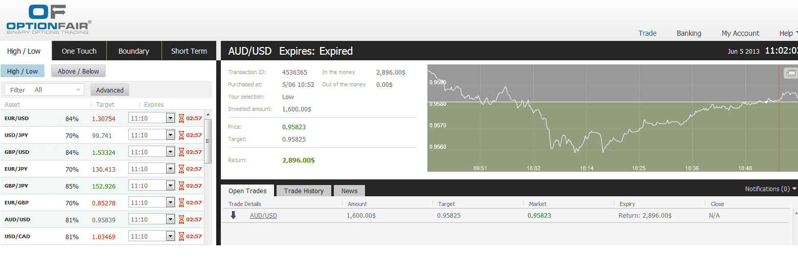 After logging on to the OptionFair binary options trading platform, I traded $1600 on the “Touch” instrument. This kind of option has a potential return of 72% if the option touches the strike price prior to expiry, which means that if the signal is correct, I could get a return of $1152 on my investment.