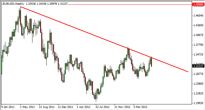 I believe that the EUR/USD pair has hit a significant crossroads. After all, the Federal Reserve now has openly stated that they are looking to pull out of the quantitative easing game, and the European Central Bank looks like it may need to loosen monetary policy even further. Look at the chart, you can see that the weekly trend line to the downside was hit over the past five sessions, and we simply fell from that level. I expect a lot of choppiness below, but rallies should be sold in my opinion.