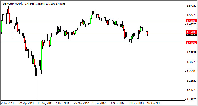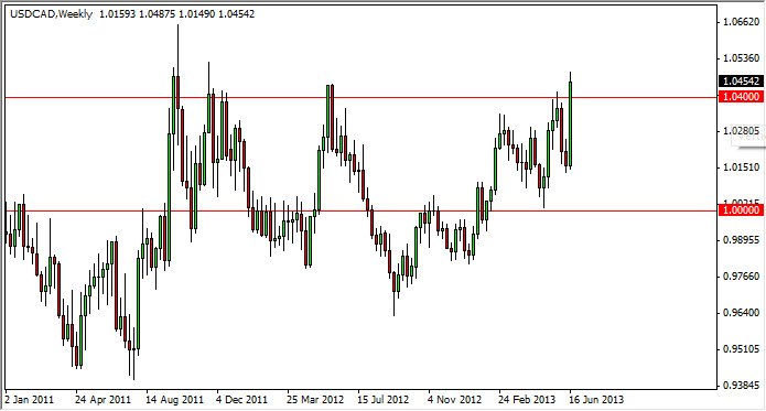 The GBP/CHF pair had a negative week overall, but as you can see we have had several neutral looking candles in a row right around the 1.45 handle. On the chart, I have zoomed out quite a bit that you can see that I have the 1.40, the 1.45, and the 1.50 levels drawn on the chart. We have been consolidating between 1.40 and 1.50 over the last two years or so, and as a result I find this to be very reliable and important. Looking at the fact that the last two weeks of been hammer like candle's, I believe a break of the range for this past week will have this market looking for 1.50, but it will be a bit choppy. I other hand, if we don't get that move I would be more than willing to buy supportive candles down at the 1.40 handle.