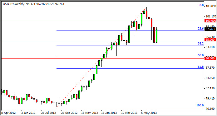 The USD/JPY pair had a strong showing over the past week, bouncing off of the 38.2 Fibonacci retracement level. This wind up with the 94 handle, which of course has been support in the past, and as a result I think that this market will continue higher. After all, the interest rates in the United States are rising on the 10 year note, while they are falling in Japan overall. This pair is highly sensitive to the 10 year note differential between the two countries, so wherever rates are rising, money flows do. Right now that has this pair going higher.