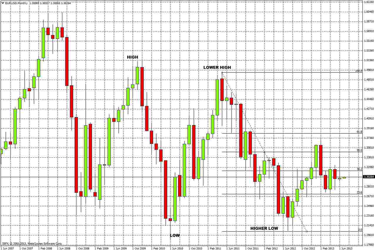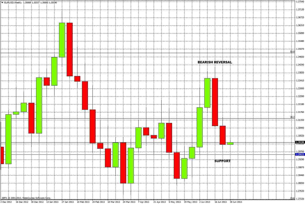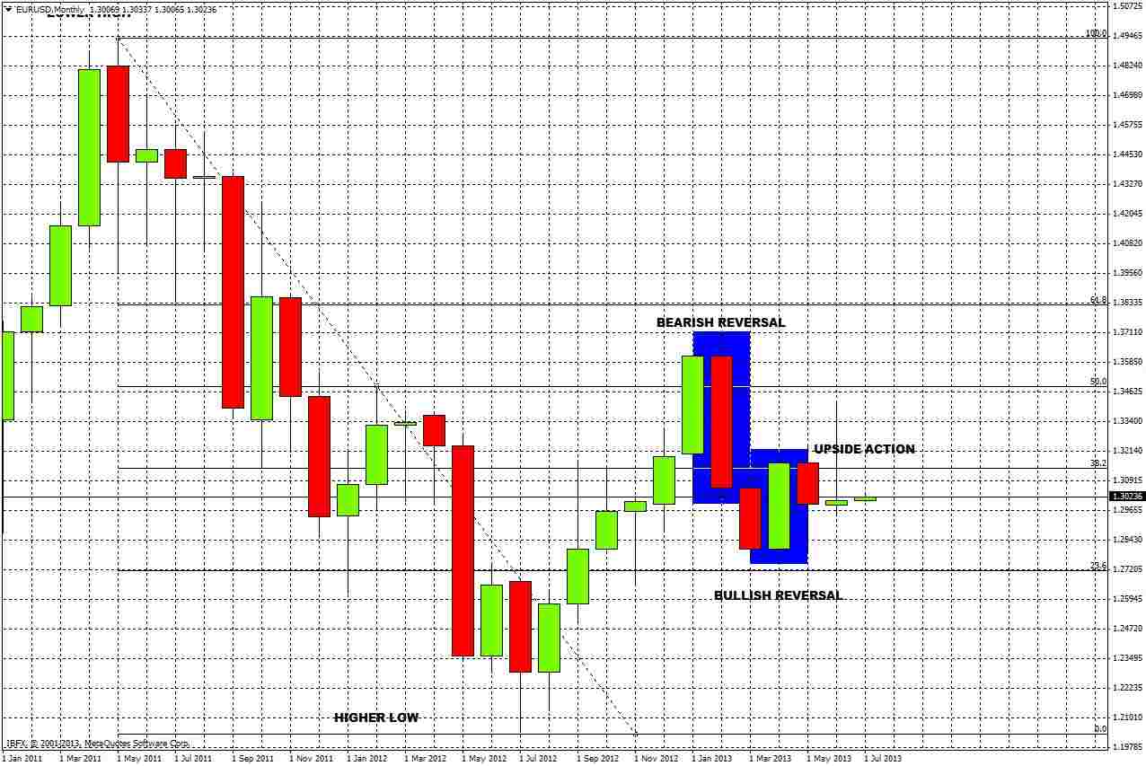 The tendency to consolidate is reinforced by recent action: the bearish monthly reversal last February at the 50% fibonacci retracement of the 2011-2012 downwards move was itself reversed by a bullish monthly reversal in April.