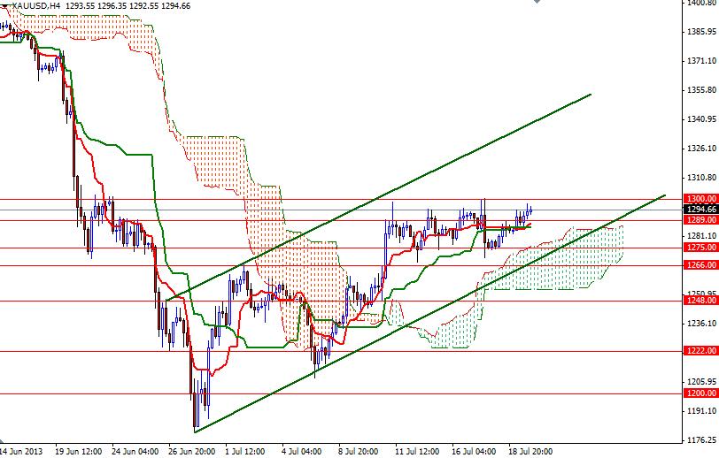 The XAU/USD pair scored a gain of 0.78% on a weekly basis as congressional testimony from Federal Reserve President Ben Bernanke, who said there was no predetermined pace of reductions in the asset purchases, eased the greenback’s safe-haven appeal. Although he has done nothing to shed light on when the quantitative program will come to an end, now the market players think that the Fed will keep its bond-buying stimulus in place at least a little longer than what they thought just a few weeks ago. However, there is one thing clear: the era of cheap central bank money is coming to an end. The lack of Fed purchases will probably affect long term interest rates and major stock markets. If investors shift money from other assets to gold market, the recent correction might continue a bit longer. Data from the Commodity Futures Trading Commission (CFTC) show that speculative investors increased their net-long position in gold to 23462 contracts, from 16557 a week earlier. Recently, the price of gold has been continuously held in check by the key 1300 upside barrier/resistance, so in order to confirm that the bulls are dominant, I believe that a sustained break above this level is essential. On the 4-hour time frame, the XAU/USD pair is trading above the Ichimoku cloud and we have a bullish Tenkan-sen (nine-period moving average, red line) - Kijun-sen (twenty six-day moving average, green line) cross, indicating that we have more pressure from the bulls than bears in the short-term. If the 1300 resistance is broken, it is likely that we will see the bulls testing the next strong resistance levels at 1321.54 and 1354. If the bulls fail and prices reverse, support can be found at 1289/5, 1275 and 1266. Once below 1266, there is little to slow this pair down until we reach the next key support at the 1248 level.