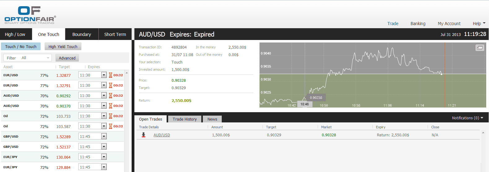 I logged in the OptionFair™ binary options trading platform and I traded $1500 on the “Touch Down” instrument. This kind of option has a return of 70% if the option touches the strike price prior to expiry, which means that if the signal is correct, I could get a return of $1050 on my investment.