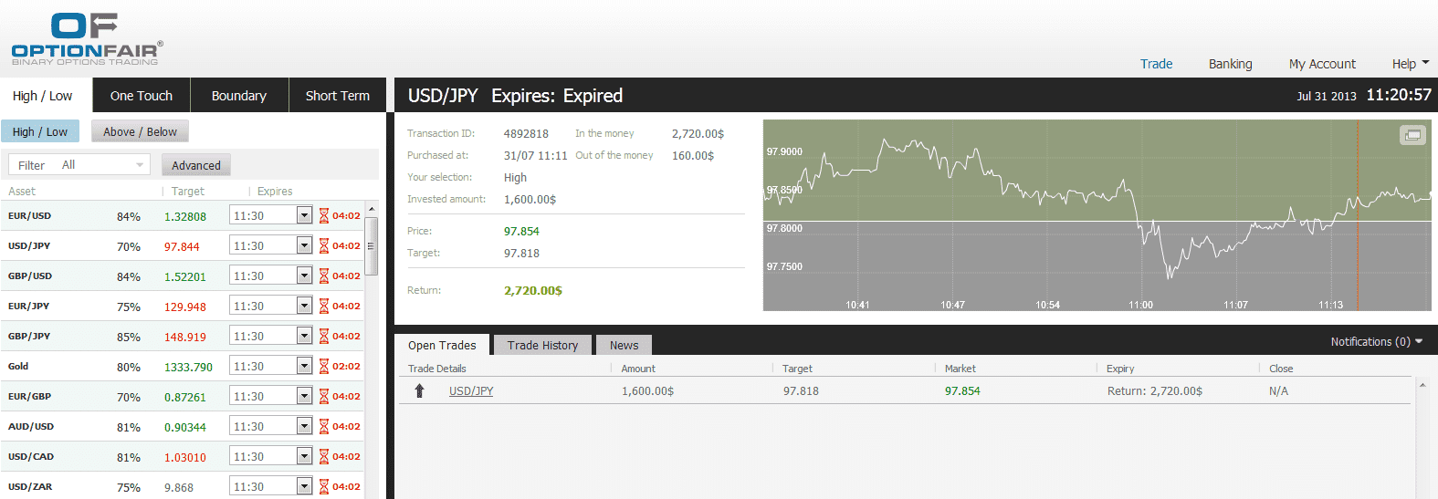 I logged in the OptionFair™ binary options trading platform and I traded $1600 on the "High" instrument. This kind of option has a return of 70% if the option will close above the target price, which means that if the signal is correct I could get a return of $1120 on my investment.