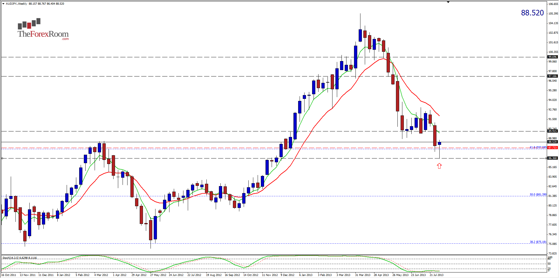 The Australian Dollar appears to be making a comeback against many of the major currencies of the world and the Japanese Yen is one of them that looks ripe for the upward momentum to capitalize on. Looking at the weekly chart we see that the pair printed a bullish Hammer, also known as a Pin Bar Reversal. The candle formed in the lower third of the previous week’s range which if you know this pattern at all, you know that this is the optimal position for the formation. Last week’s low kissed the 61.8% Fibo retracement level for calculated from the June 2012 low at 74.49 to the 2013 high at 105.42. The pair also tested, and so far rejected the support level at 88.00 which has been a key level for the pair numerous times in the past. The pair broke the former support level at 99.00 only 2 weeks ago and this may just be the pair re-testing this area as resistance now, as it took 8 weeks for the pair to break through this area on the bearish run. If we do get back above 90.00, there is all kinds of room to the upside with 93.50 and 97.00 being the most obvious targets. Happy Trading!