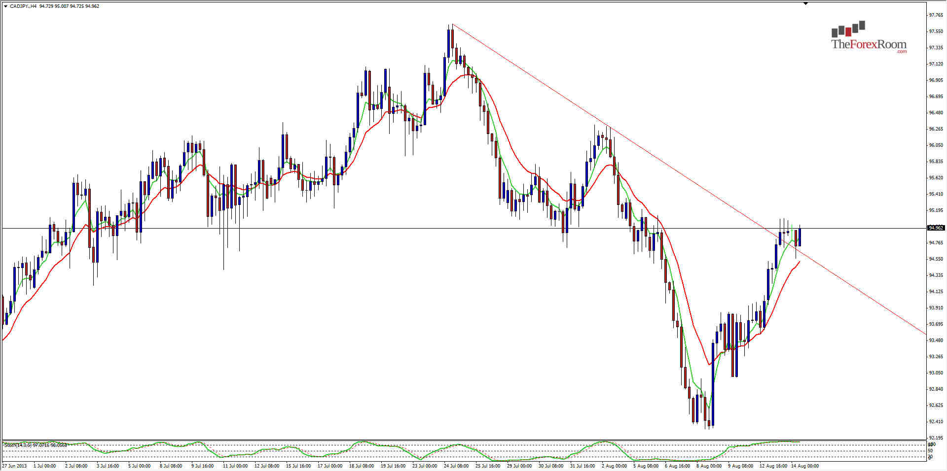 The CAD/JPY, like most Yen crosses this week is continuing to look rather bullish. In the case of the CAD/JPY we see that it reached a resistance area at 95.00 then spent the last 16 hours consolidating and is now poised to push through resistance and head higher. the pair also broke a descending trend-line on the 4 hour chart and held its ground outside of this line adding to the bullish outlook. With resistance strong at 95.00 and 95.50 traders will need to be cautious until we can close above the 96.50 level. 97.50 will then be the most likely target on the way back up potentially to parity. Support below is at 94.50 (this pair likes round numbers!) and again at 94.00. Happy Trading!