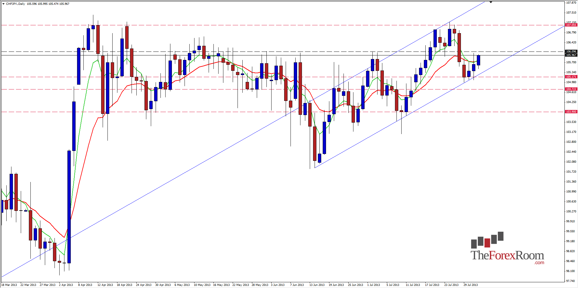 The CHF/JPY is trading in a daily ascending channel. The channel is anchored at 101.85 from July 06, 2013 which is just above the 61.8% Fib Retracement level, and has tested the lower band 3 times with the second touch coming at the support level and 38.2% Fibo at 103.81. Mr. Bernanke and US data gave the markets a shove today, which also pushed the CHF/JPY back to the upside after being bearish most of last week. Should the channel hold as it seems to be, we should see this pair move to the top of the channel at around 107.50 which is also the Monthly R1, bearing in mind that we have additional resistance at 106.67 aka the Weekly R1, and the Non Farm Payrolls even in the US on Friday.