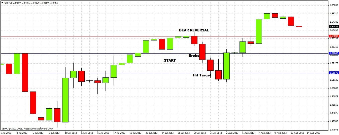 My first prediction was spot on. The daily chart below shows that although the on very same day of my analysis we had a bullish reversal candle, the price was held firm by resistance at 1.5389, and it fell and broke 1.5280 and reached 1.5157 quite quickly.