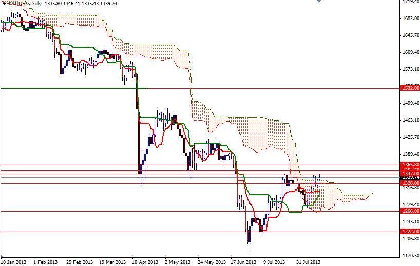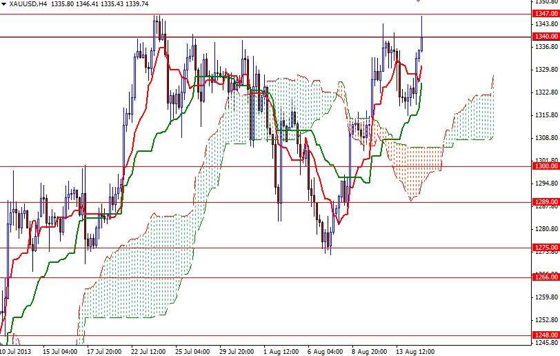 The XAU/USD pair ended yesterday's session higher than opening as the conditions in the marketplace have increased the precious metal’s safe-haven appeal. Data released yesterday showed that producer price index was unchanged in July. Gold also drew strength from Federal Reserve Bank of St. Louis President James Bullard's comments on quantitative easing. Bullard said “The Committee still needs to see more data on macroeconomic performance for the second half of 2013 before making a judgment on this matter”. He also noted that the labor sector has improved since the Federal Reserve adopted its current asset purchase program in September 2012 but the labor force participation rate was still weak.