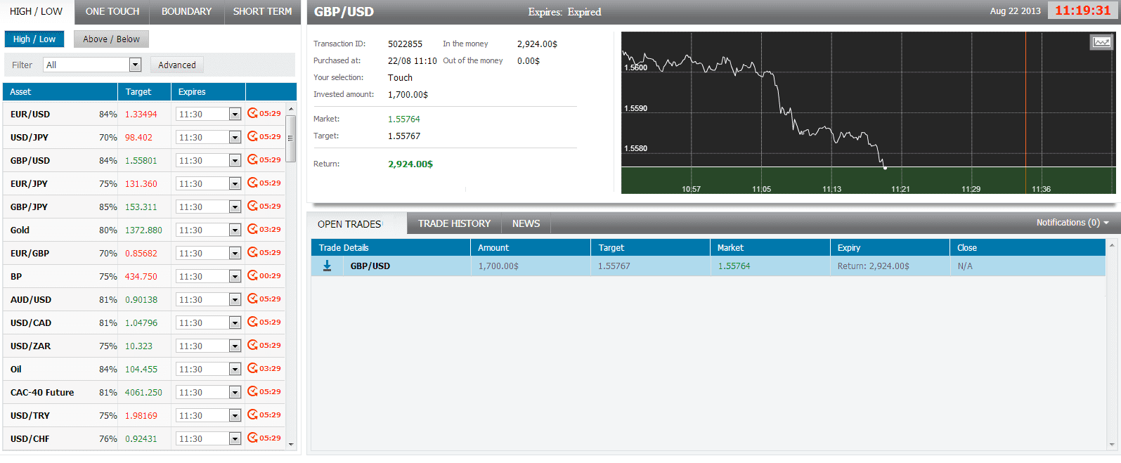 The market price for the GBP/USD at the buying time (11:10) was 1.55856 and the target price was 1.55767 for the expiration of 11:45. The Asset touched my target price at 11:19 and I made $1224.