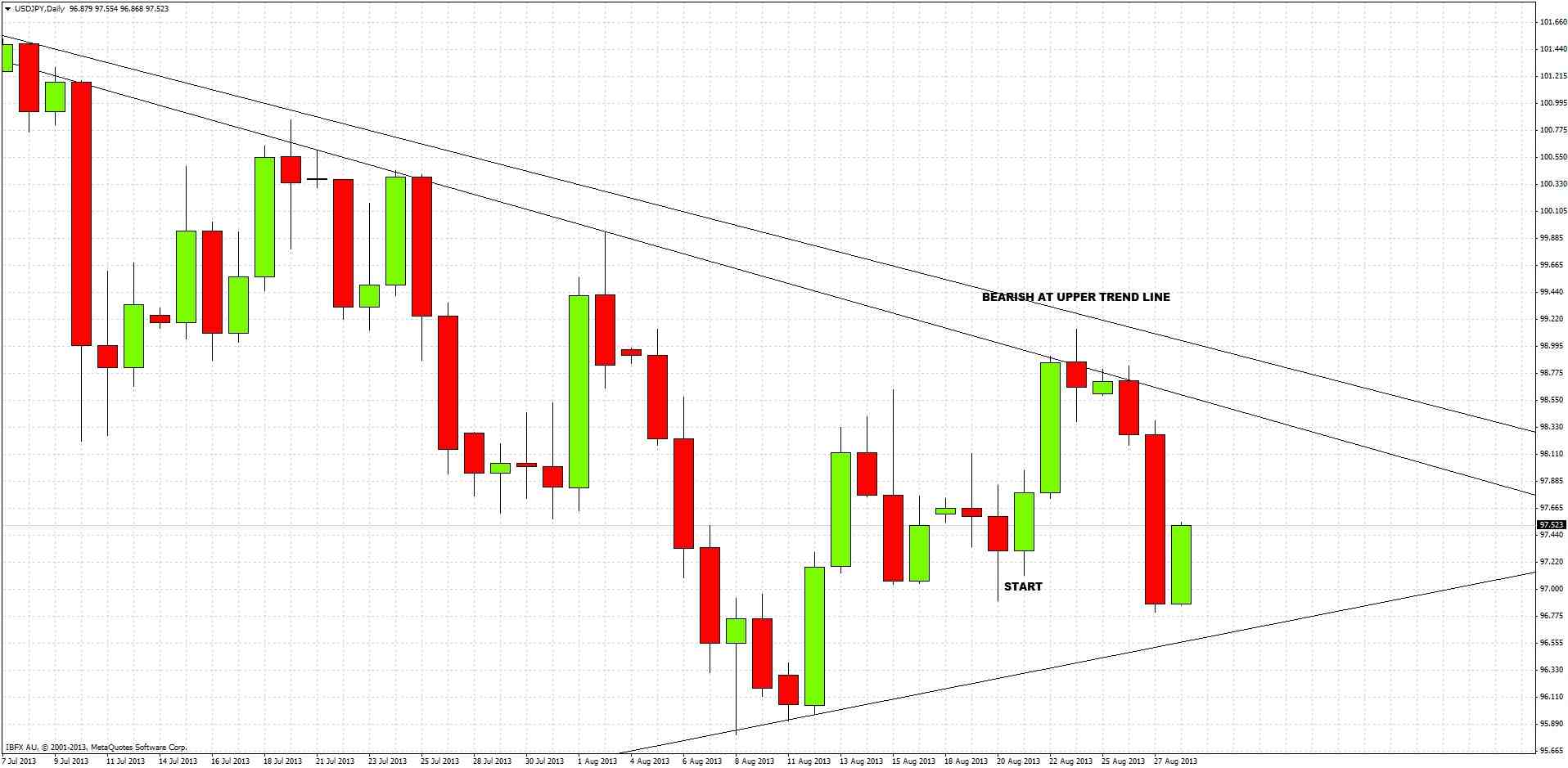 This worked out excellently. The next day closed very bullishly but right on the upper triangle trend line. There was no daily close beyond it, and the price fell pretty sharply after that, in fact it just hit last week’s low. So trading a reversal at the trend line would have been a great short trade: