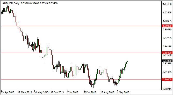 This is one of those pairs that will react violently to the Federal Reserve and whether or not it chooses to taper off of quantitative easing. This is because the Australian dollar is so highly leveraged to gold, which of course will get a nice bid if the increased liquidity continues out of the Federal Reserve. On the other hand, if they do taper off, this could send this pair straight back down. That's why I think that the markets will struggle to get above the 0.95 level as people are not necessarily sure one way or the other.