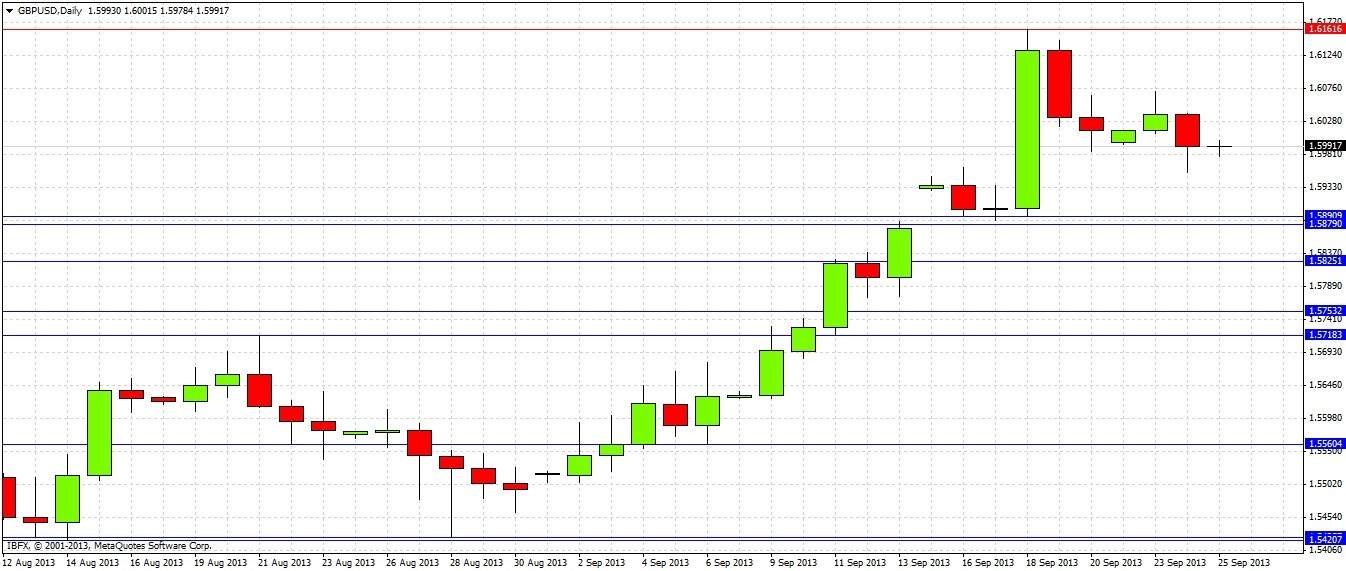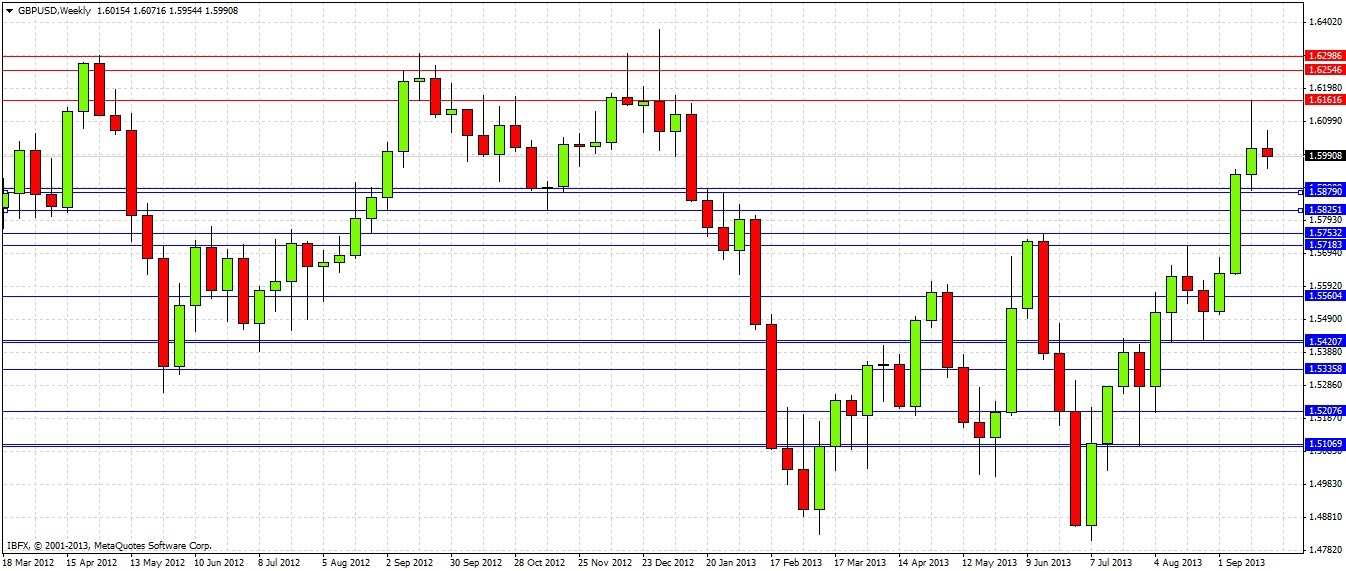 What has actually happened over the week that has passed since then, is that the price moved sharply up to a high of 1.6162 that same night, and has been falling fairly steadily ever since. The technical significance of 1.6000 was forgotten in the surprising announcement by the Fed about continuing without tapering, which had the immediate effect of weakening the USD temporarily.