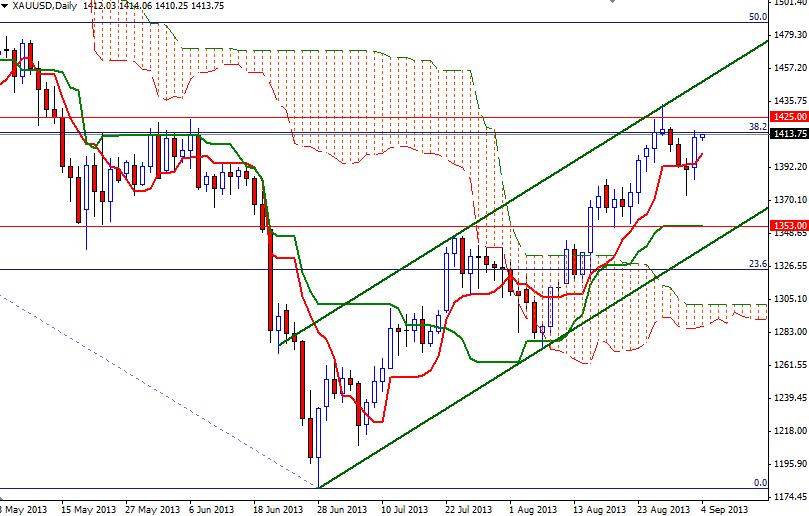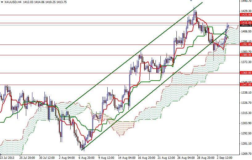 The XAU/USD pair managed to break above the 1408 resistance level which I pointed out yesterday and traded as high as 1416.29 after President Obama won support from leaders in the U.S. Congress for a military action against Syria. Speaker of the House of Representatives John Boehner said “The use of these weapons has to be responded to, and only the U.S. has the capability. I’m going to support the president’s call for action and I believe my colleagues should support this call for action”. Since we climbed above the Ichimoku cloud and the daily chart and broke above the 1347 level, the gold market has been looking for reasons to go higher. Because of that I think the bulls will be taking advantage of this situation and try to break through 1416 - 1425 zone.