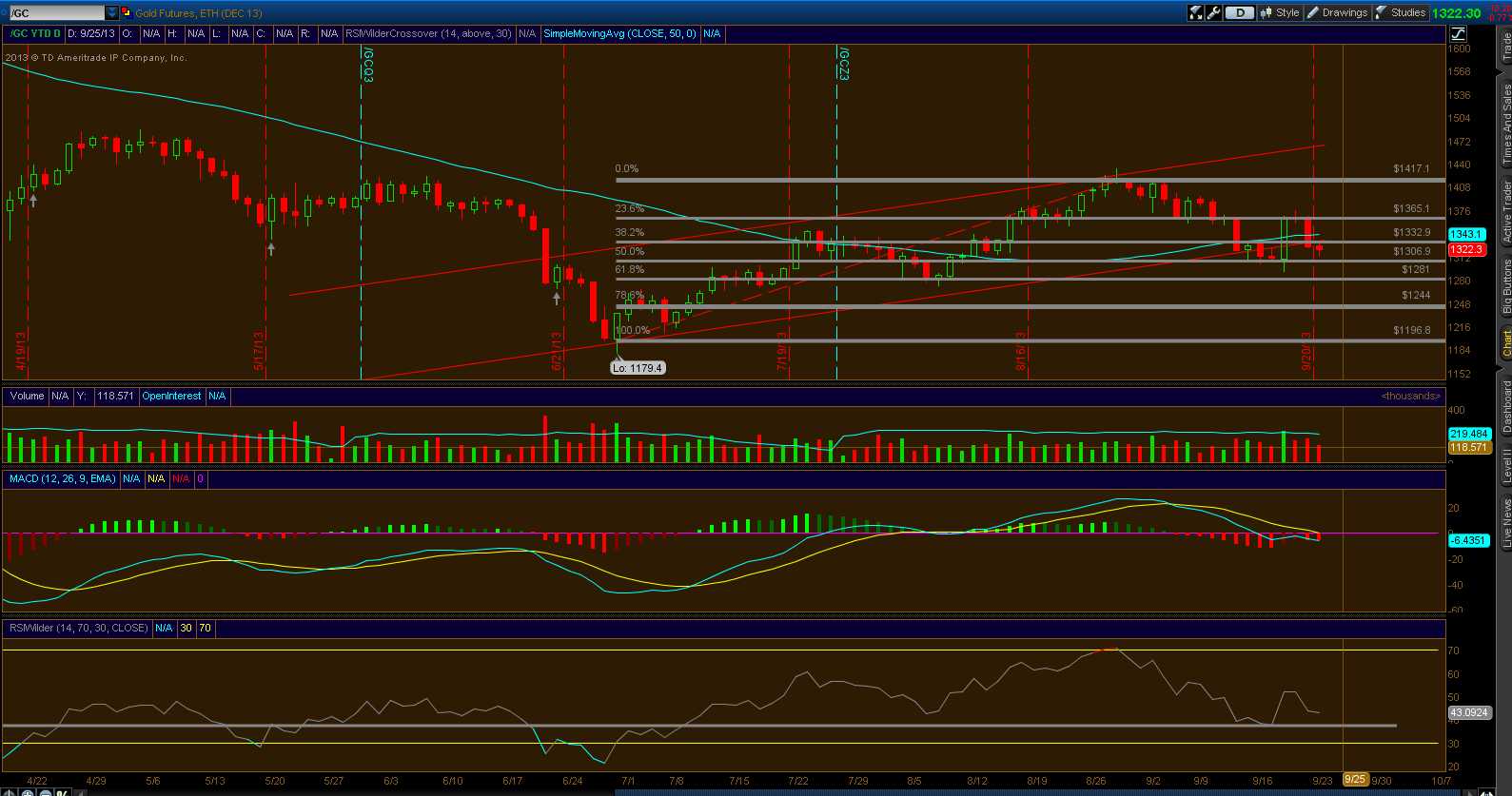 Gold was off $10 on Monday, currently at 1322 (as of 430 PM EST). Using the 1200 low close and current bottom, Gold recently bounced directly off the 50% retracement level, at 1306, and met resistance at 23.6%, or 1365. That makes the current range to hold a 3 month rally 1306 – 1365. The 50% retrace for this level is 1332, which is also near its 50 day of 1343.