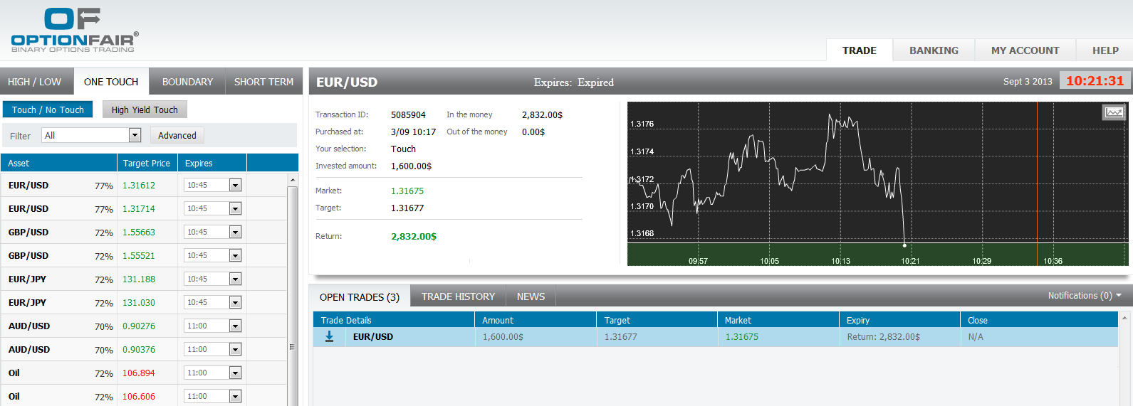 With optionFair™ binary options trading platform, I traded $1600 on the “Touch Down” instrument. This kind of option has a return of 77% if the option touches the strike price prior to expiry, which means that if the signal is correct, I could get a return of $1232 on my investment.