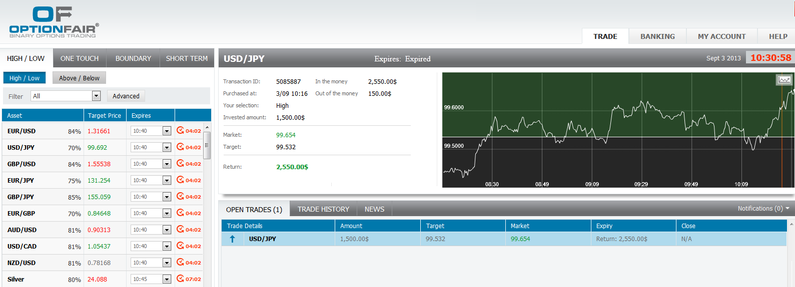 I logged in the OptionFair™ binary options trading platform and I traded $1500 on the "High" instrument. This kind of option has a return of 70% if the option closes above the target price, which means that if the signal is correct I could get a return of $1050 on my investment.
