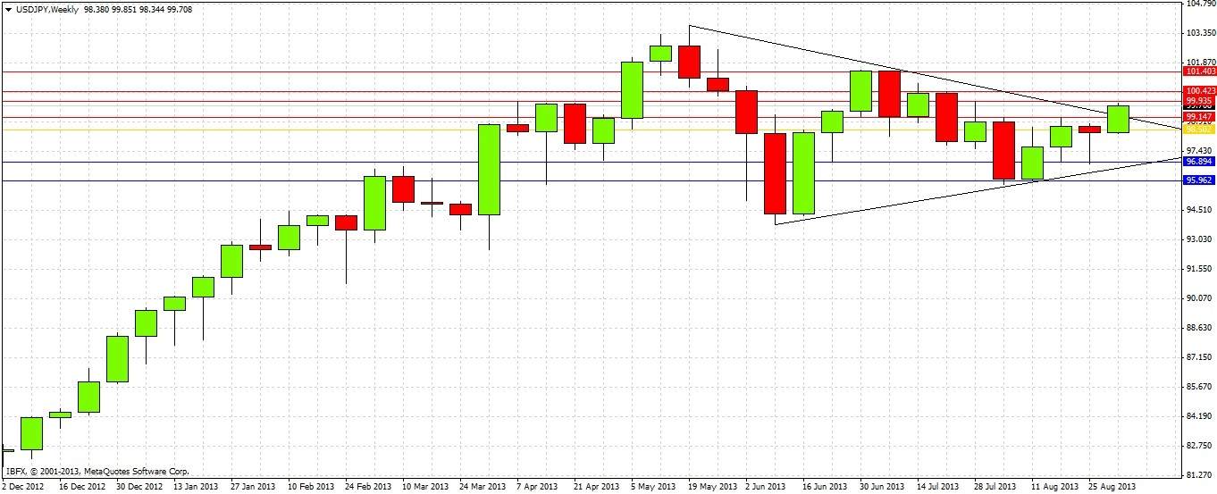 This is more interesting, as it reveals that we have two potential resistance levels above us at 100.42 and 101.40, caused by the highs of the two bearish reversal weeks. It is unclear if these will be significant resistance or not, they should be noted anyway.