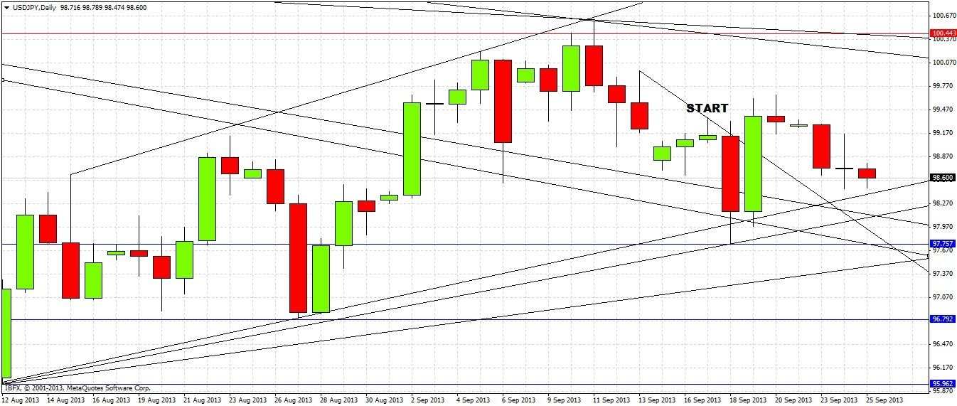 This prediction had a mixed encounter with reality. The price fell sharply after the Federal Reserve's announcement last Wednesday evening, but returned quickly, so although 98.54 was broken the price only spent about 3 hours below this level, and the bullish channel's lower trend line held well. The price made a new low of 97.75. The other levels mentioned were not hit. We can see how it played out in the daily chart below since the “START” label: