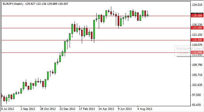 The EUR/JPY pair tried to rally for most of the week, but as you can see gave back quite a bit of the gains. The candle of course is a shooting star but it sits right on top of the 130 level, an area that has been very supportive lately. The shape of that shooting star suggests that perhaps we will go through the support area, but there is also significant support at the 128 handle, and most certainly at the 125 level. That being the case, I believe that waiting for this pair to pull back slightly in order to form a supportive candle will be the way to go forward.