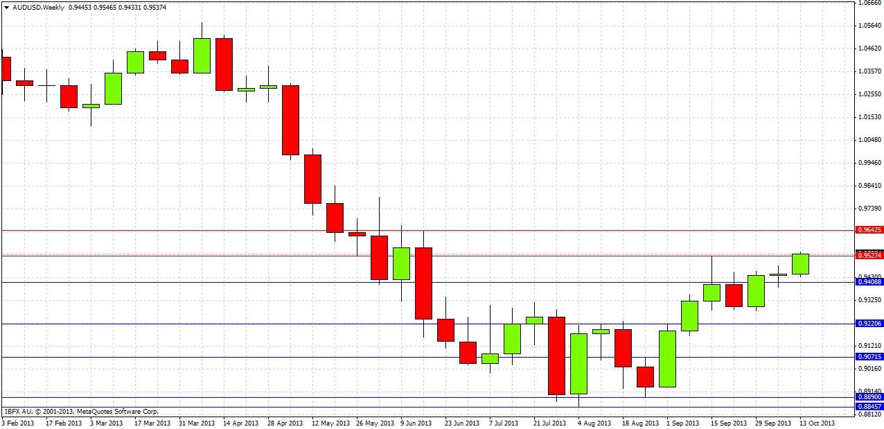 The picture over the coming week does not seem clear. There is no real reason to abandon a generally bullish bias. What is likely to be crucial is how well the price will hold up in this area above 0.9527. If it holds up, it is likely to rise to 0.9600, or even 0.9643. However it is unlikely to break through this zone just yet, there will probably have to be a period of consolidation first. If the price does not hold up, it may fall back down to 0.9400 where it is very likely to find support. A breakdown below this level would be a very bearish sign.