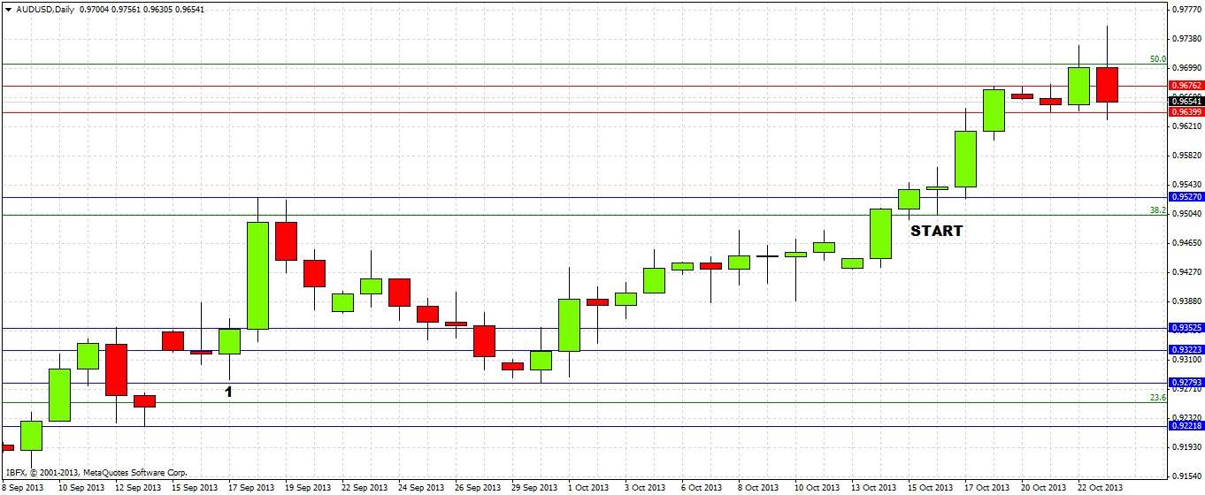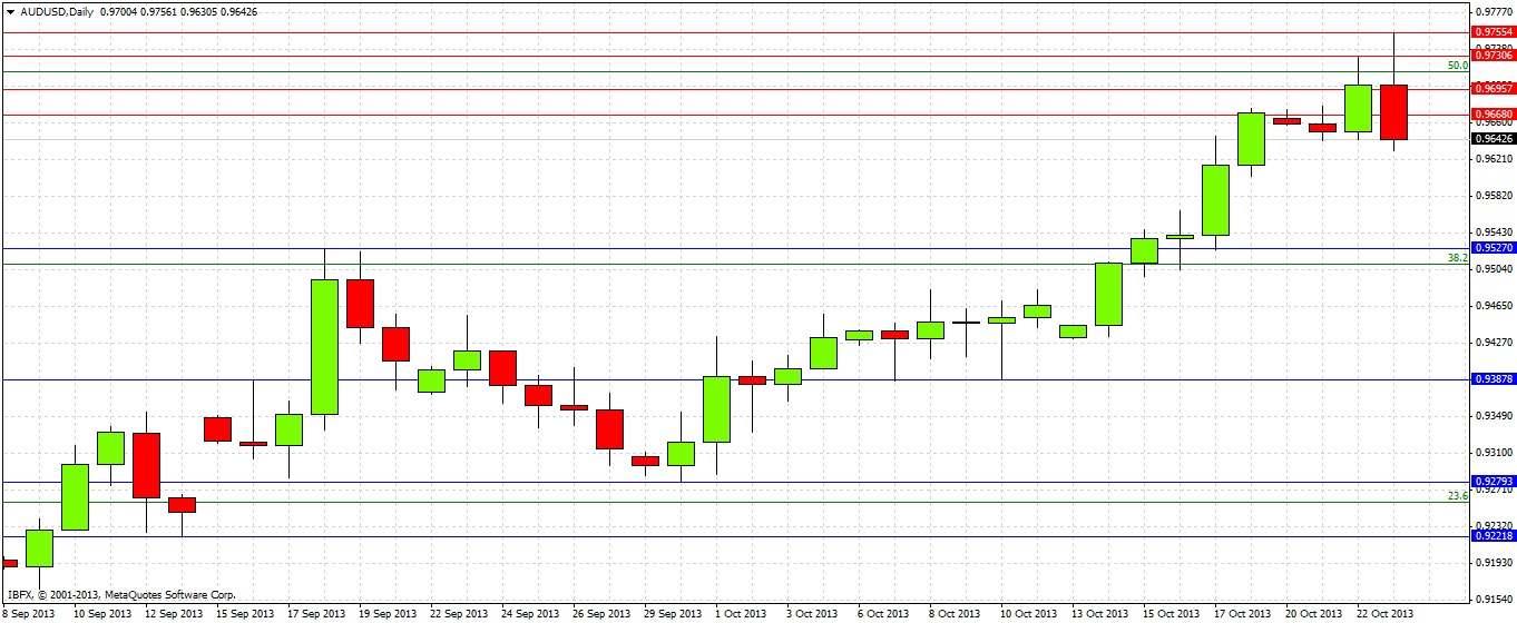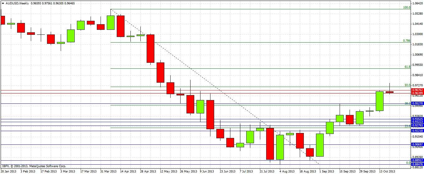 This weekly chart shows that last week formed a strongly bullish candle, closing hard on its high. However a zone of strong resistance was reached early this week at around the 0.9700 zone, which is a confluence of a few weekly highs and lows and also the 50% Fibonacci retracement of the strong downwards move that occurred from March to August earlier this year.