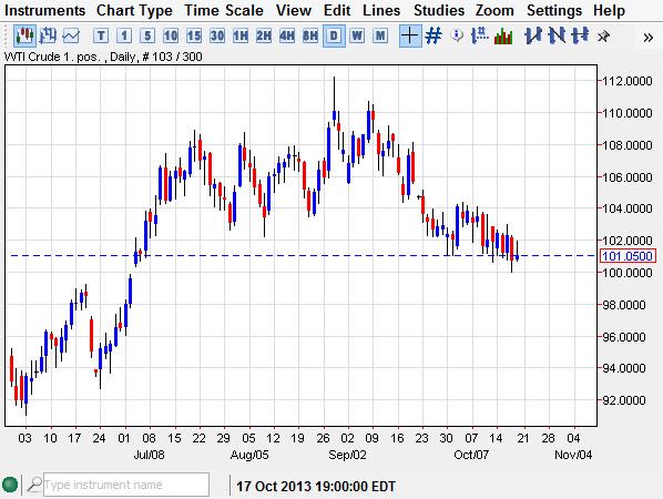I am tired of typing this quite frankly, but there is a massive correlation between the Dollar and Oil markets in general right now. The Federal Reserve looks likely to sit still as far as tapering off of quantitative easing is concerned, so this will work against the Dollar obviously. This will more than likely push the price of oil higher in general, and as a result I think this market will stay somewhat afloat – even if it looks a bit suspicious at the moment.