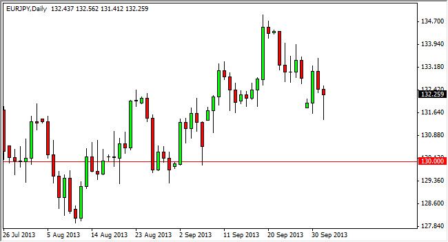 The EUR/JPY pair fell during the balance of the session on Wednesday, but as you can see got enough of a bounce near the 131.50 level in order to form a nice looking hammer. This is the top of a larger consolidation area, so I think it's a natural place to see a bounce that could significantly affect the market. A break of the top of the hammer should send this market back towards the 135 level, which is my target to begin with. I recognize the fact that the 134 level is resistance, and as a result we could expect some noise in the general vicinity. However, I do believe that we will eventually get to that aforementioned 135 handle.