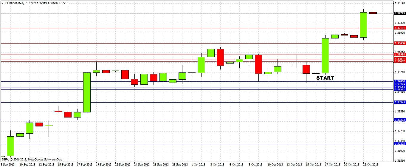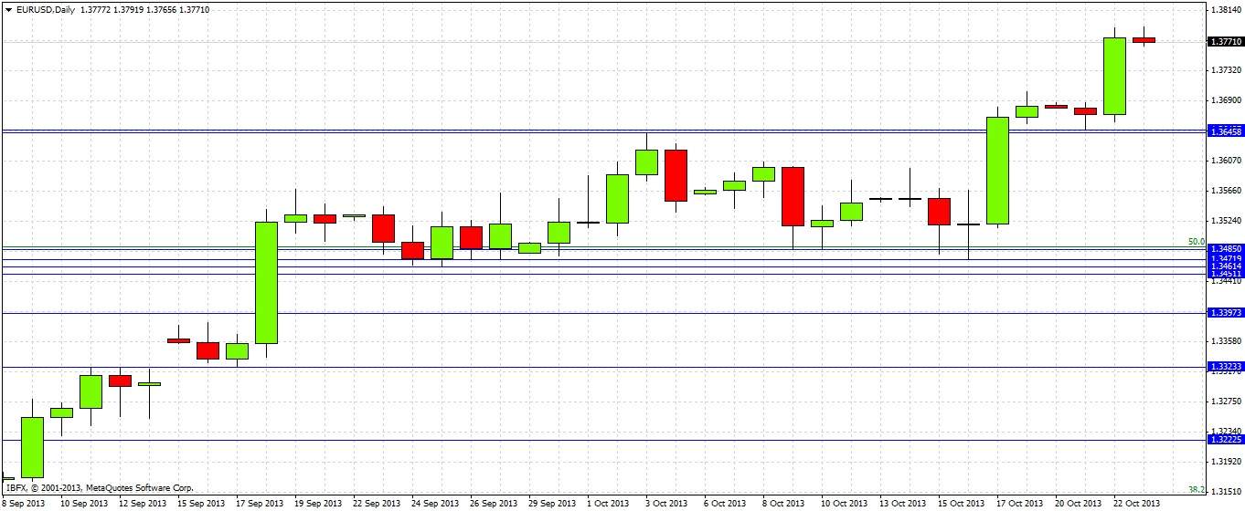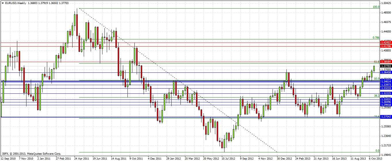 We are seeing high prices that have not been reached for almost 2 years, since November 2011. We have to make the chart small so we can see the relevant history. Last week was a strongly bullish reversal candle that closed in its top quartile. Prices have followed higher this week to reach a near 2-year high. There is no obvious resistance ahead now until 1.3858. Below us, a previous weekly high at 1.3646 that is also this week's low could become a strong support level in any pull back next week. We can see that this area, which acted as strong support recently, coincides with the 50% Fibonacci retracement of the long-term large downwards move during 2011-2012. The 61.8% level, close to the possible price action resistance level at 1.3858, could also be key.