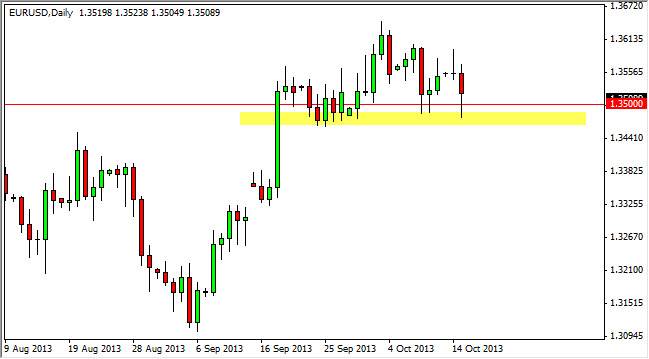 The EUR/USD pair spent most of the day on Tuesday falling, but as you can see found enough support just below the 1.35 handle in order to bounce and form a fairly nice looking hammer. This hammer of course signifies that we could see buyers stepping into the market, and it would make sense as we are towards the bottom of the consolidation area that we had recently been trading in.