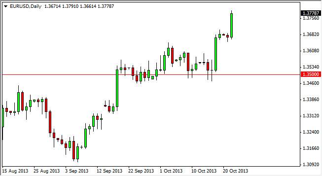 We blasted through the 1.37 level, which shows just how strong this move was. In fact, I think that we are heading to the 1.40 level relatively soon, and probably even quicker than most people anticipate. This is more or less the "last nail in the coffin" as far as any ideas of tapering are concerned in the near-term, and as a result this gives the market carte blanche to start selling the dollar again.